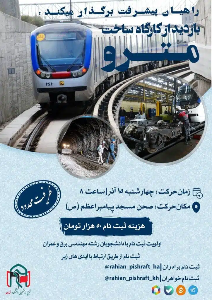 به گزارش معاونت فرهنگی و اجتماعی،  چهارشنبه ۱۵ آذر ساعت ۸ صبح از کارگاه ساخت مترو بازدید به عمل می‌آید.