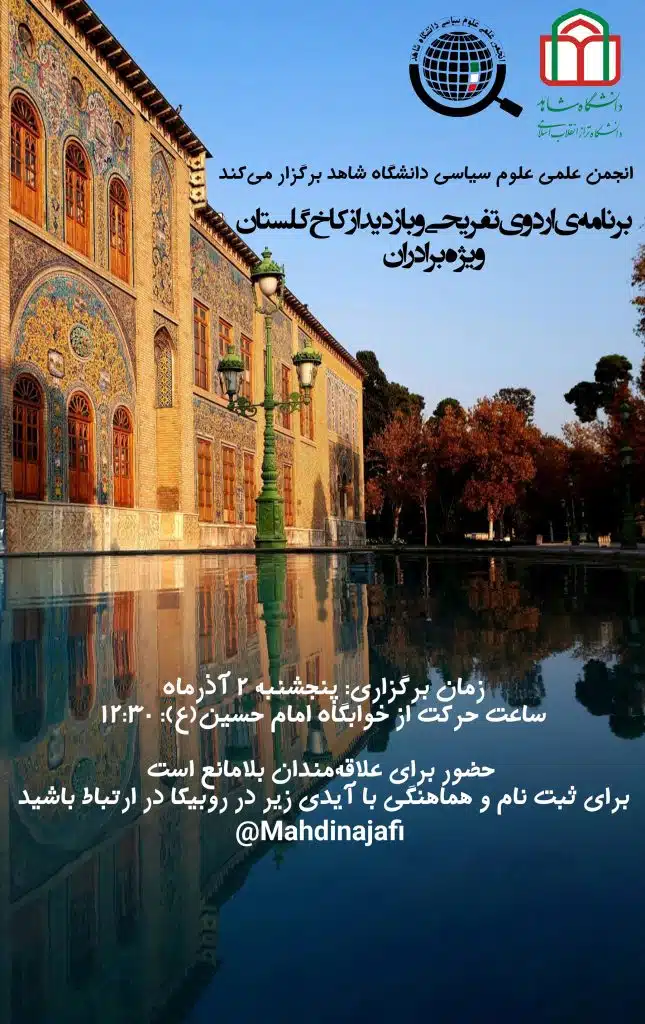 به گزارش معاونت فرهنگی و اجتماعی، اردوی تفریحی و بازدید از کاخ گلستان به همت انجمن علمی علوم سیاسی دانشگاه پنجشنبه 2 آذر ماه 1402 برگزار میگردد.