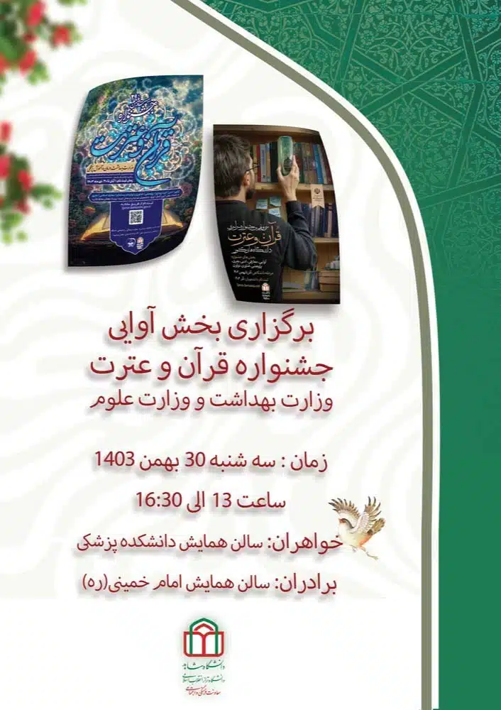بخش آوایی جشنواره قران و عترت ویژه وزارت بهداشت و وزارت علوم سه شنبه 30 بهمن ماه 1403 از ساعت 13 الی 16:30