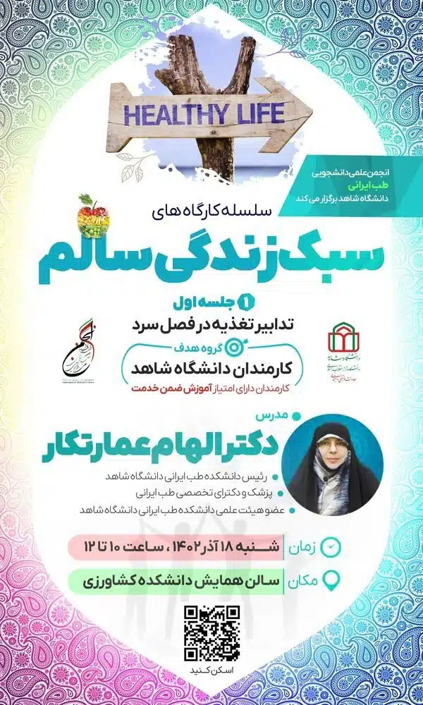 به گزارش معاونت فرهنگی و اجتماعی، جلسه اول سلسله کارگاههای سبک زندگی سالم در باب “تدابیر تغذیه در فصل سرد” شنبه 18آذر ماه 1402 ساعت 10 الی 12 در سالن همایشهای دانشکده کشاورزی برگزار میگردد.