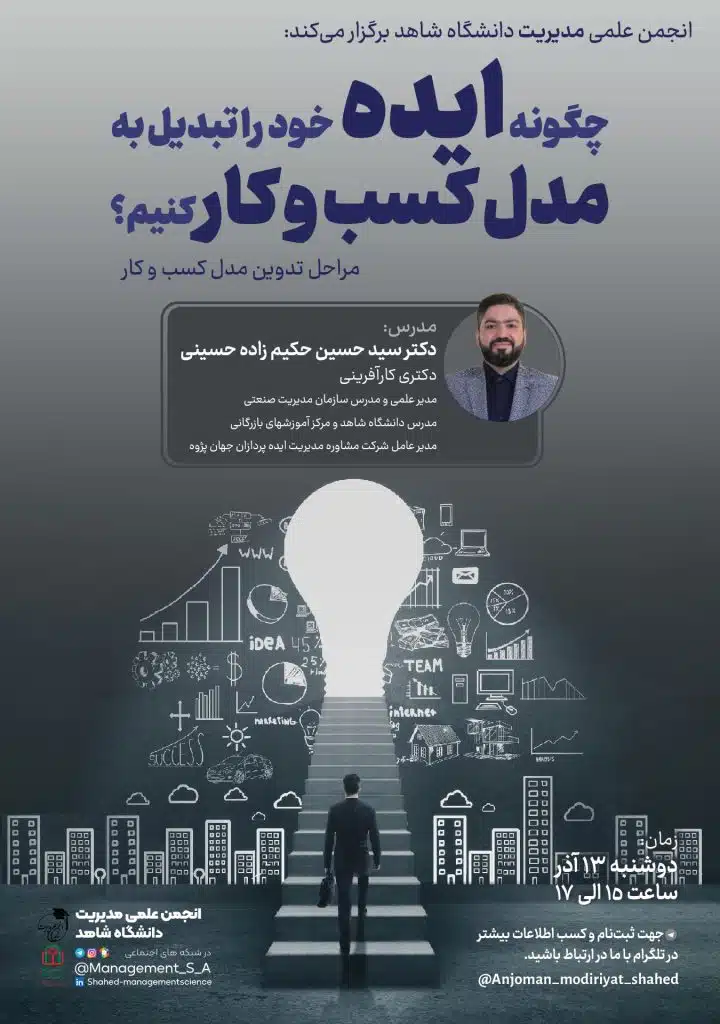 به گزارش معاونت فرهنگی و اجتماعی، دوره آموزشی “چگونه ایده‌ی خود را تبدیل به مدل کسب‌وکار کنیم؟” ،  مراحل تدوین مدل کسب‌وکار به همت انجمن علمی مدیریت دانشگاه، دوشنبه 13 آذرماه 1402 از ساعت 15 الی 17 در سالن آمفی‌تئاتر دانشکده‌ی علوم انسانی برگزار می‌گردد.