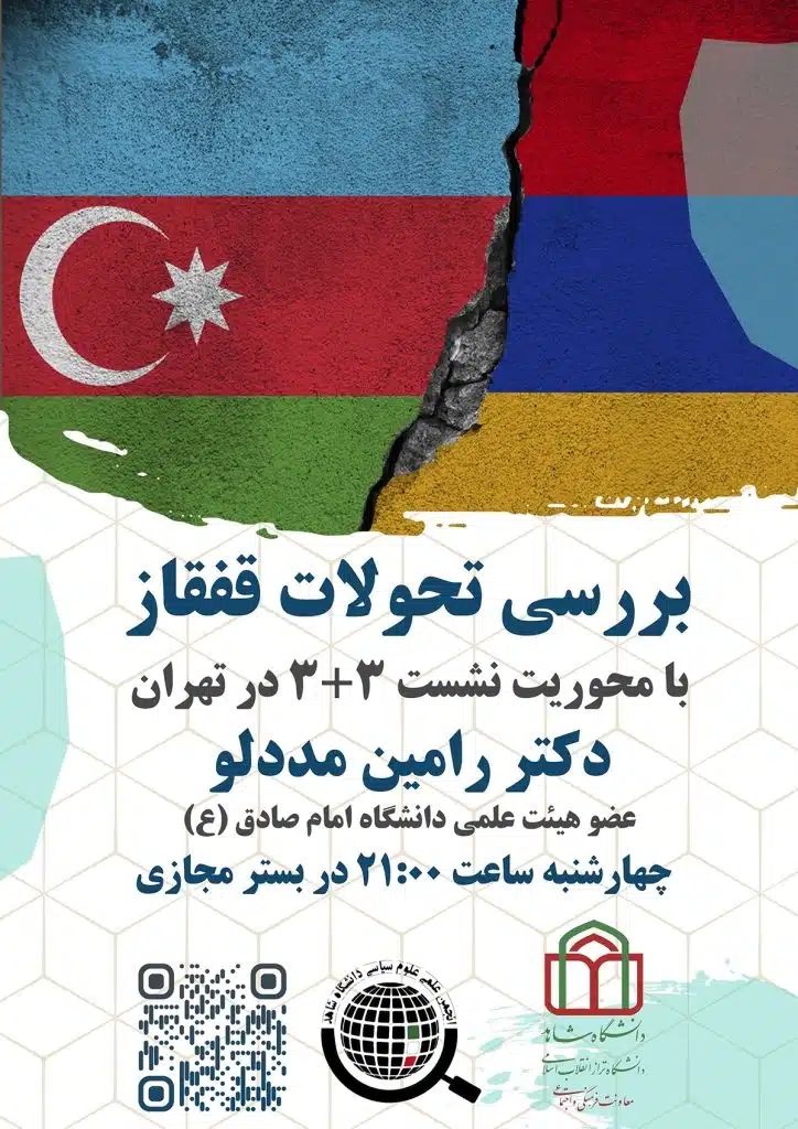 به گزارش معاونت فرهنگی دانشگاه، نشست بررسی تحولات حوزه قفقاز با محوریت نشست ۳+۳ در تهران به همت انجمن علمی علوم سیاسی دانشگاه شاهد با ارائه جناب آقای دکتر مددلو عضو هیئت علمی دانشگاه امام صادق (ع) چهارشنبه ۳ آبان ماه ساعت ۲۱ به صورت مجازی برگزار میگردد .