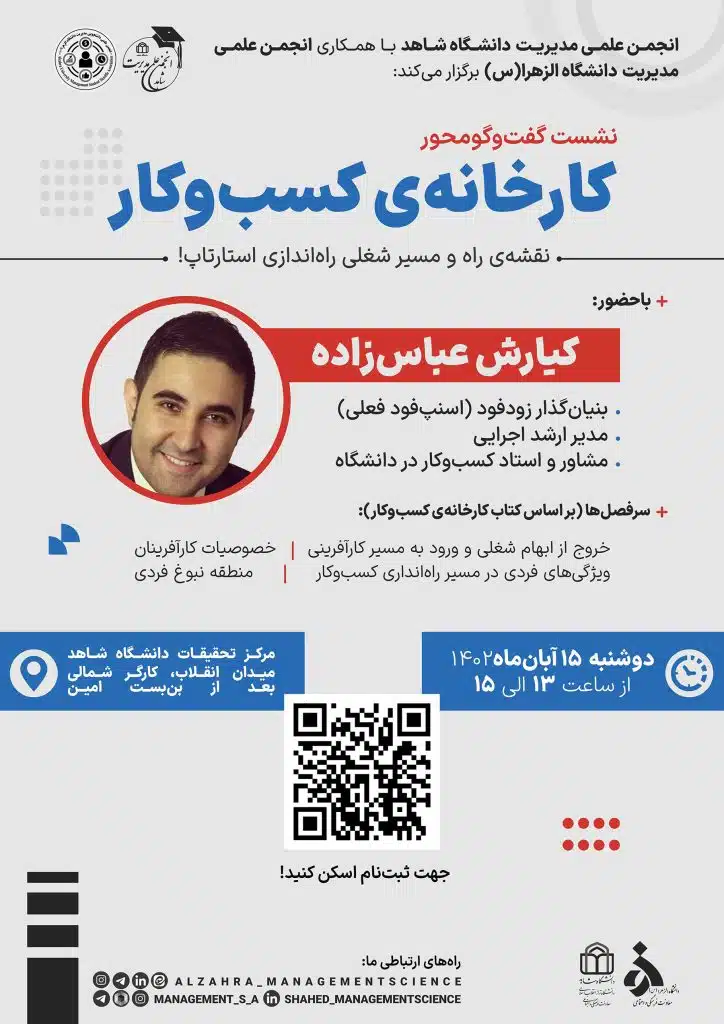 به گزارش معاونت فرهنگی و اجتماعی، نشست گفتوگو محور کارخانهی کسب و کار با عنوان “بررسی نقشهی راه راهاندازی استارتاپ” به همت انجمن علمی مدیریت دانشگاه شاهدو با همکاری انجمن علمی مدیریت دانشگاه الزهرا(س) دوشنبه ۱۵ آبان ماه ساعت ۱۳ تا ۱۵ در مرکز تحقیقات دانشگاه شاهد برگزار میگردد.