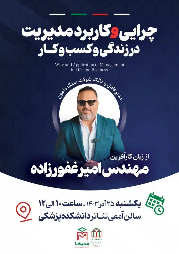 همایش “چرایی و کاربرد مدیریت در زندگی و کسبوکار” یکشنبه 25 آذر ماه ساعت 10 الی 12 باحضور مهندس امیر غفورزاده (مدیرعامل و مالک شرکت سنگ دامون) در سالن آمفیتئاتر دانشکده پزشکی برگزار میگردد.
