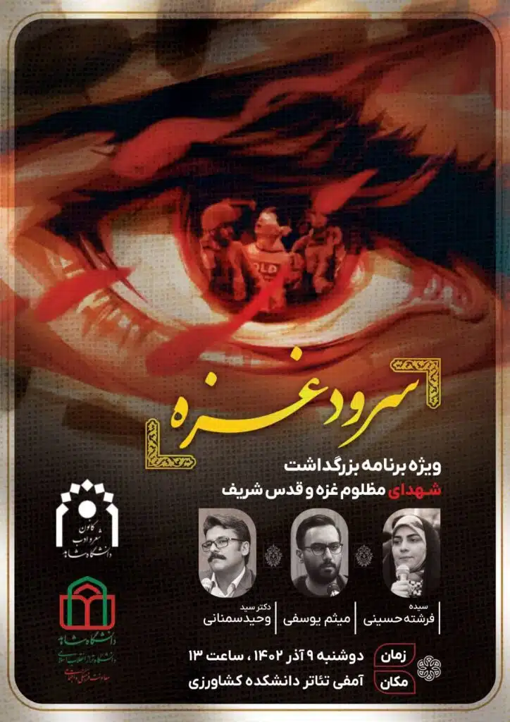 به گزارش معاونت فرهنگی و اجتماعی، ویژه برنامه بزرگداشت شهدای  مظلوم غزه و قدس شریف (سرود غزه)، به همت کانون شعر و ادب دانشگاه، دوشنبه 13 آذر ماه 1402 ساعت ۱۳ الی ۱۵ در سالن آمفی تئاتر دانشکده کشاورزی برگزار می‌گردد.