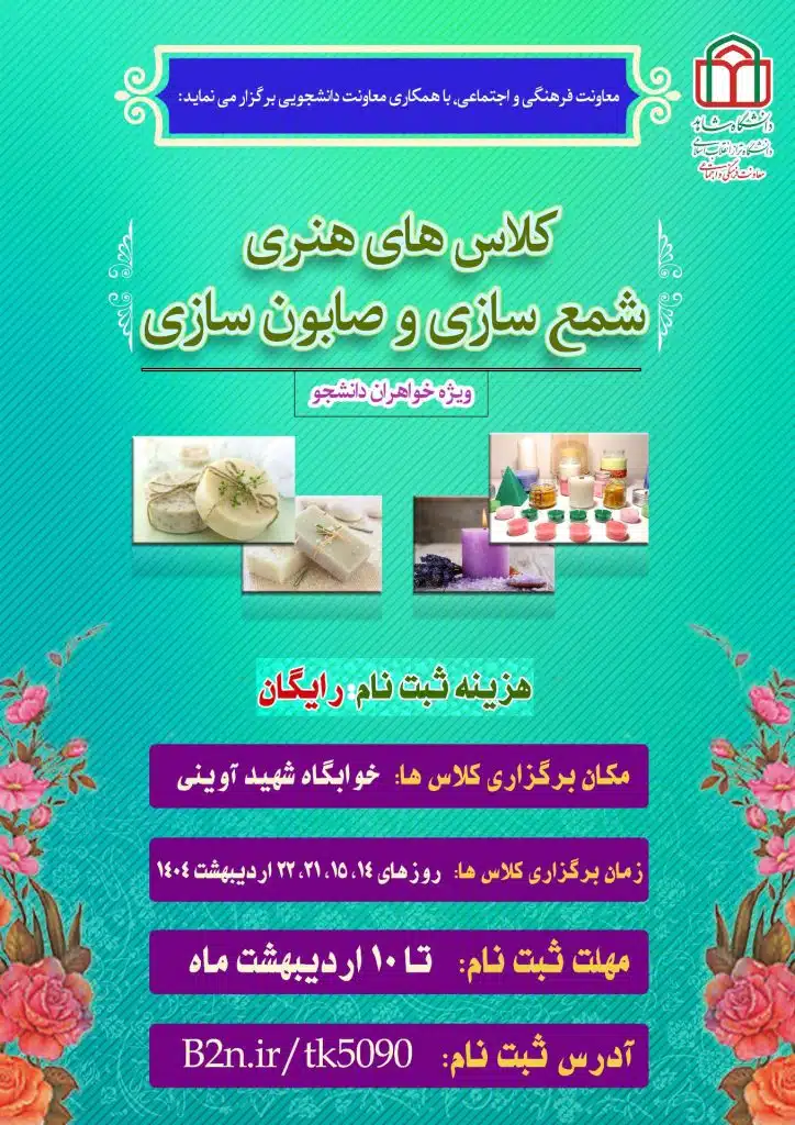 معاونت فرهنگی و اجتماعی با همکاری معاونت دانشجویی به مناسبت هفته خوابگاه ها، کلاس‌های هنری شمع‌سازی و صابون‌سازی، ویژه خواهران دانشجو را برگزار می‌نماید.