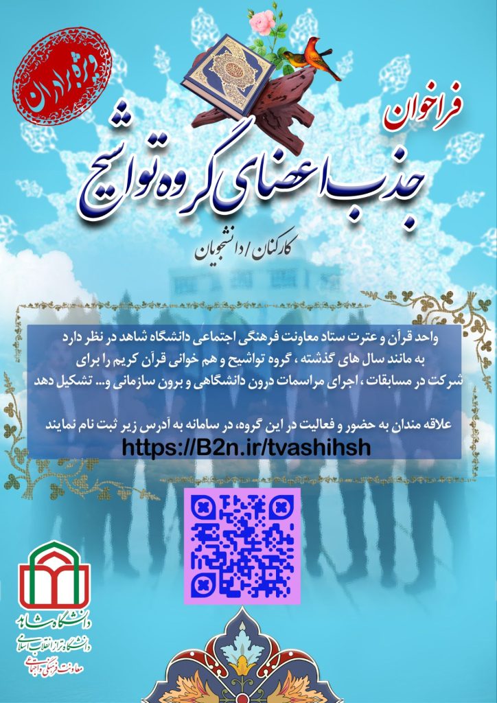 واحد قرآن و عترت ستاد معاونت فرهنگی و اجتماعی دانشگاه شاهد از بین علاقه مندان ؛ دانشجویان /کارمندان به عضویت در گروه تواشیح و همخوانی قرآن کریم عضو فعال میپذیرد. جهت عضویت در سامانه زیر ثبت نام نمایید؛ https://b2n.ir/tvashihsh جهت کسب اطلاع بیشتر با شماره زیر تماس حاصل فرمایید؛ جناب آقای معصومی : ۰۹۱۲۰۷۴۴۷۶۴