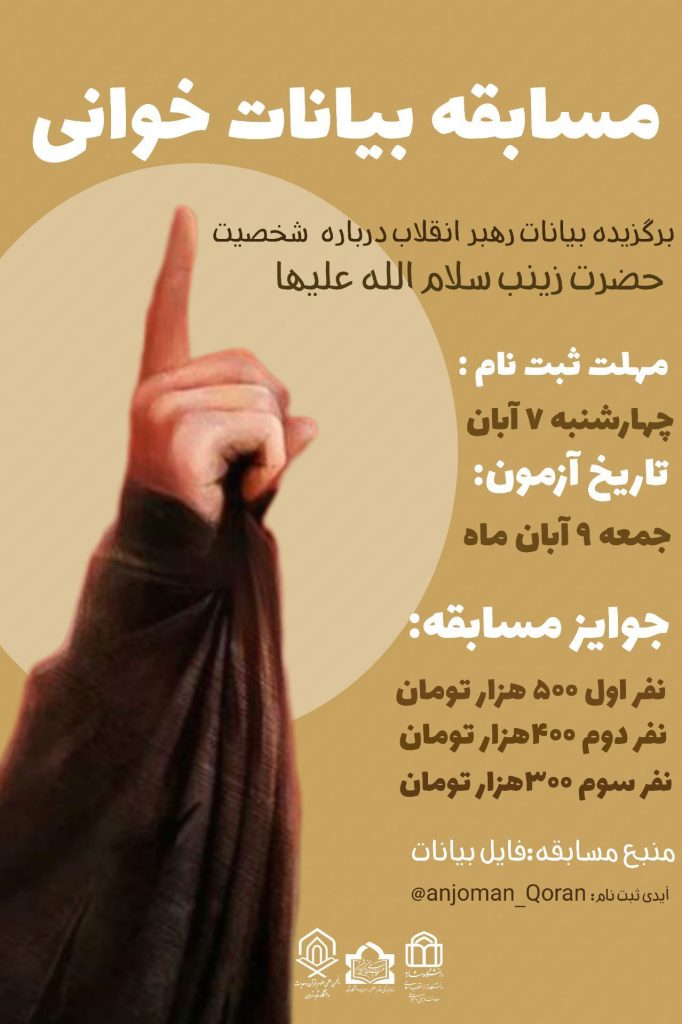 مسابقه ی بیانات خوانی به مناسبت ایام ولادت حضرت زینب (سلام علیها) با محوریت《برگزیده بیانات رهبر معظم انقلاب پیرامون شخصیت حضرت زینب (س)》انجمن علمی علوم قرآن و حدیث دانشگاه شاهد با همکاری حوزه علوم اسلامی، جمعه 9 آبان ماه برگزار می‌گردد.