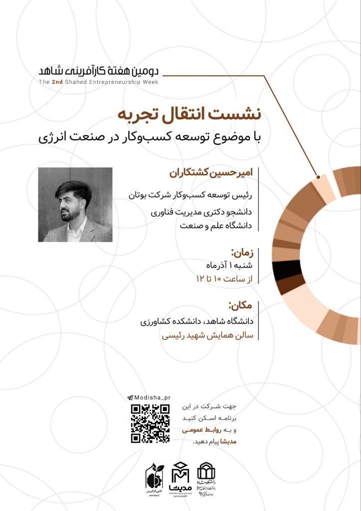 نشست انتقال تجربه با موضوع توسعه کسب و کار در صنعت انرژی به همت انجمن علمی مدیریت دانشگاه شاهد و (مدیشا) با همکاری کانون کارآفرینی دانشگاه شاهد شنبه 1 آذر ساعت 10 الی 12 در دانشکده کشاورزی برگزار می‌گردد.