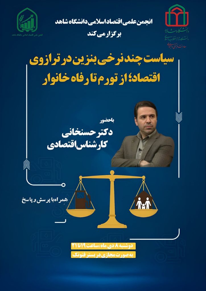 نشست سیاست چند نرخی بنزین در ترازوی اقتصاد؛از تورم تا رفاه خانوار به همت انجمن علمی اقتصاد اسلامی با حضور دکتر حسنخانی دوشنبه 8 دی میاه از ساعت 19 الی 21 در بستر مجازی فنوتک برگزار میگردد.