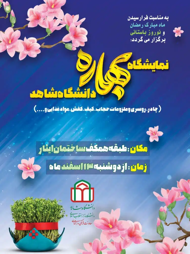 به مناسبت فرا رسیدن ماه مبارک رمضان و نوروز باستانی، نمایشگاه ملزومات حجاب، کیف،کفش، مواد غذایی و ….. ویژه خانواده دانشگاه شاهد برگزار می گردد.