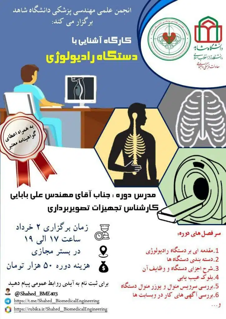 کارگاه آشنایی با دستگاه رادیولوژی به همت انجمن علمی مهندسی پزشکی جمعه 2 خرداد 1404 ساعت 17 الی 19 به صورت مجازی و در بستر ادوبی کانکت برگزار میگردد.