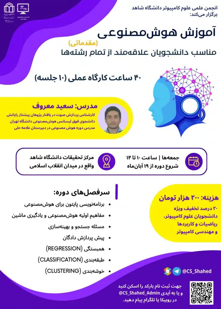 به گزارش معاونت فرهنگی و اجتماعی، کارگاه آموزشی هوش مصنوعی (مقدماتی) به همت انجمن علمی علوم کامپیوتر برگزار میگردد.