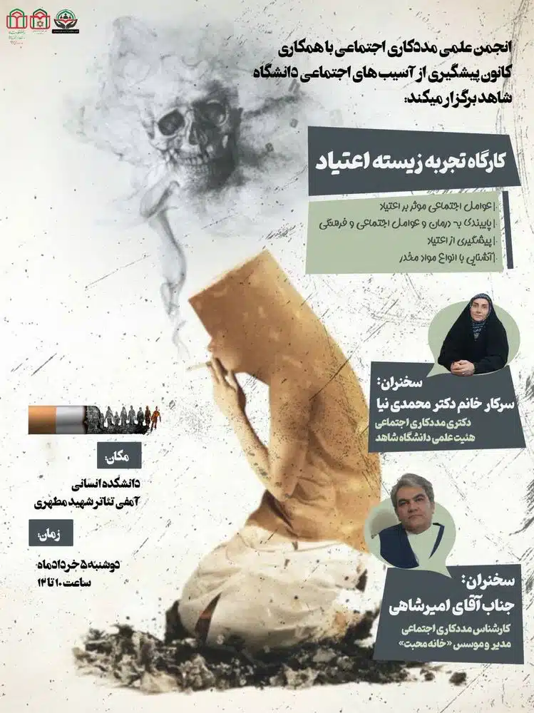 کارگاه تخصصی “تجربه زیسته اعتیاد” | کشف ارتباط اعتیاد و عوامل اجتماعی دوشنبه 15 خرداد ساعت 10 الی 12 در آمفی تئاتر شهید مطهری داشکده علوم انسانی برگزار می‌گردد.