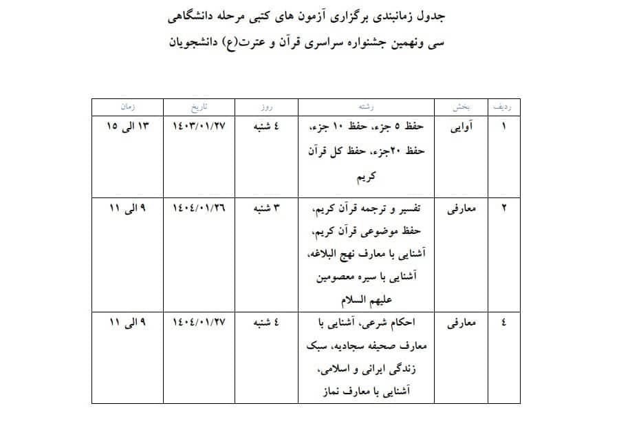 جدول زمانبندی برگزاری آزمون های کتبی مرحله دانشگاهی سی و نهمین جشنواره سراسری قرآن وعترت دانشجویان (وزارت علوم)